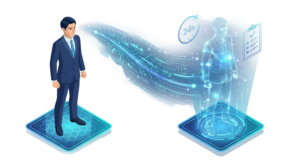 - トップセールスや熟練管理者の「判断基準」「ノウハウ」をAIに学習させます。